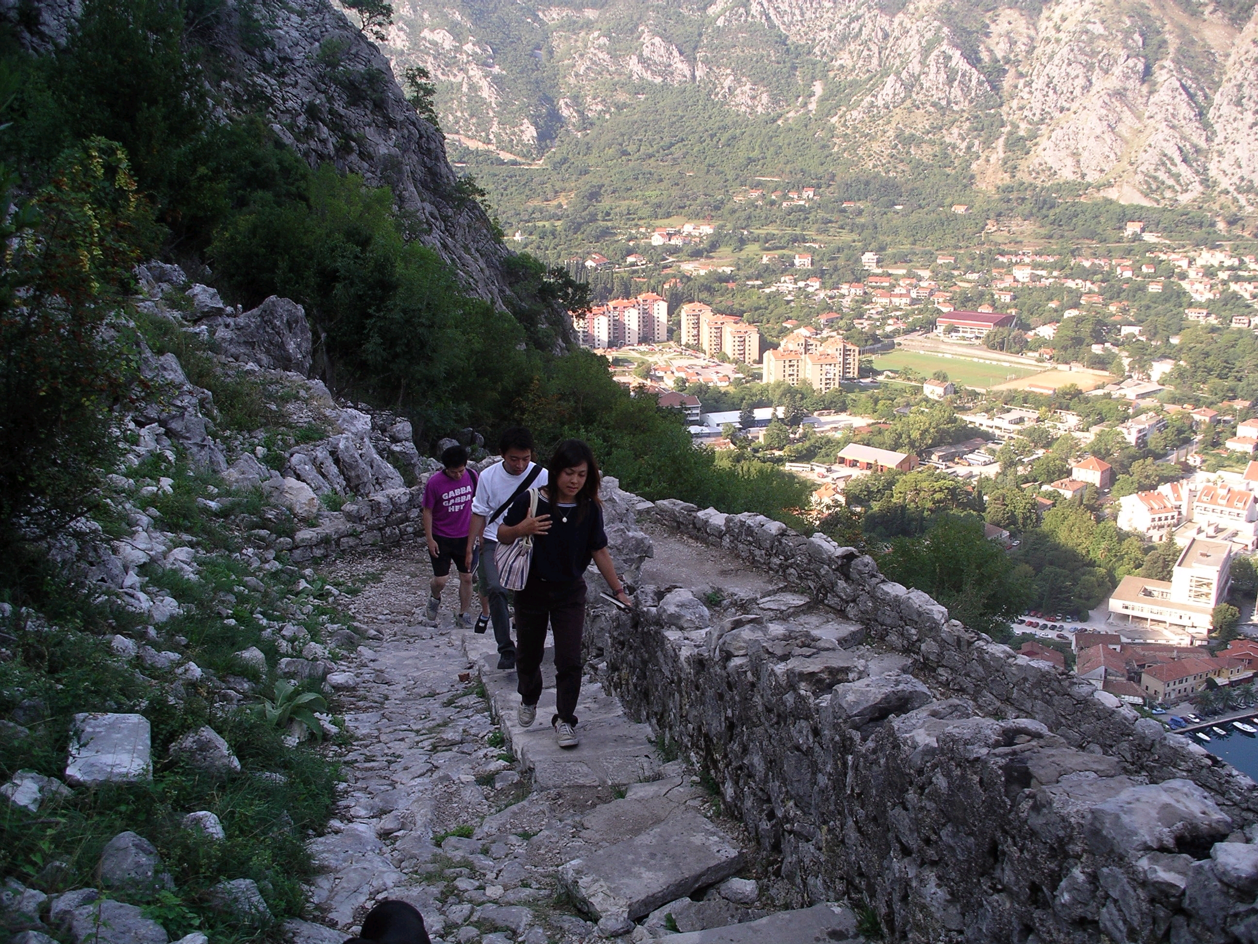 次第に標高が高くなり、コトルの街を一望できるようになってきた。ここからだと街が城壁に囲まれているというのがよく分かる。まぶしい朝日に照らされた街の眺めは、なかなかよいものであった。