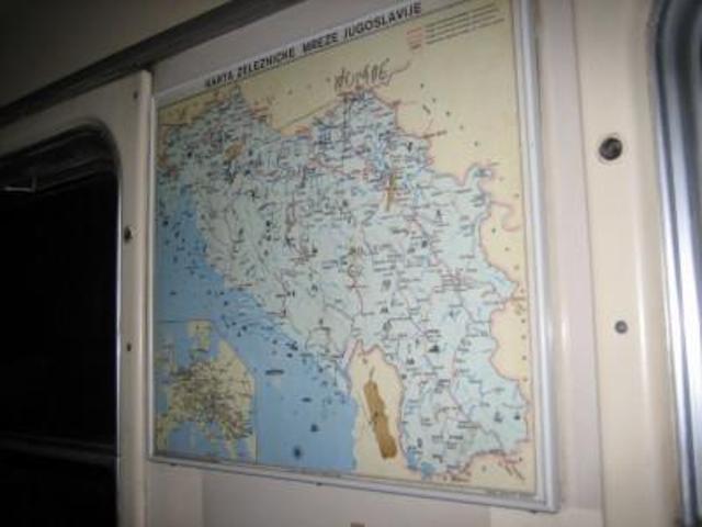私たちが乗ったのは、客車がほとんどが一等車で、食堂車も連結された、「ビジネストレイン《という若干高級な急行列車であった。私たちも、一等乗車券を買っている。だが、一等車にもかかわらず、シートはくたびれ、車体には落書きが目立つなど、それほどきれいであるとは言えない。私たちが入った2つのコンパートメントのうち1つは、窓が開かない状態であった。また、客車にはいまだに、旧ユーゴスラビア時代の古い鉄道地図がはってあった。