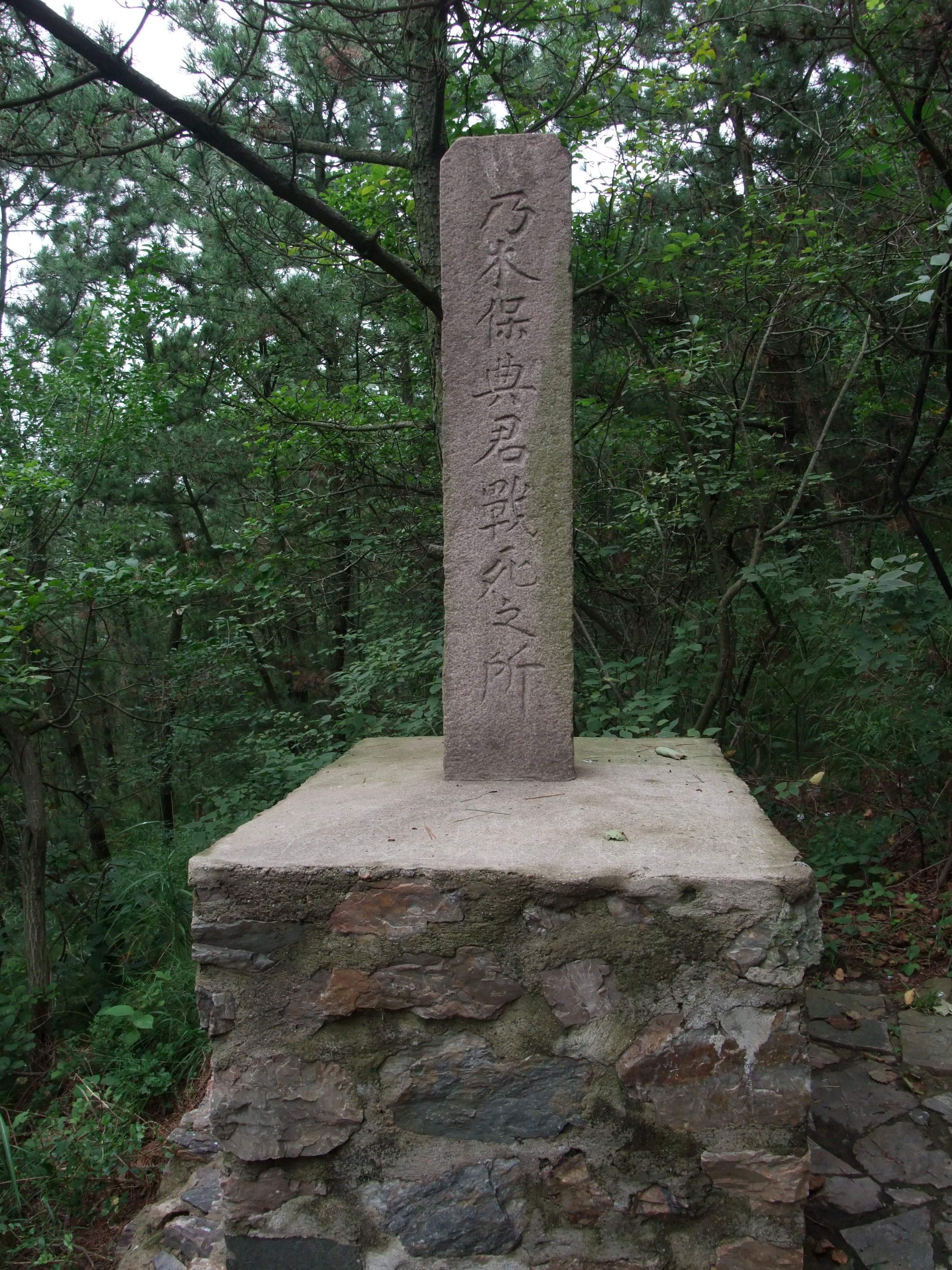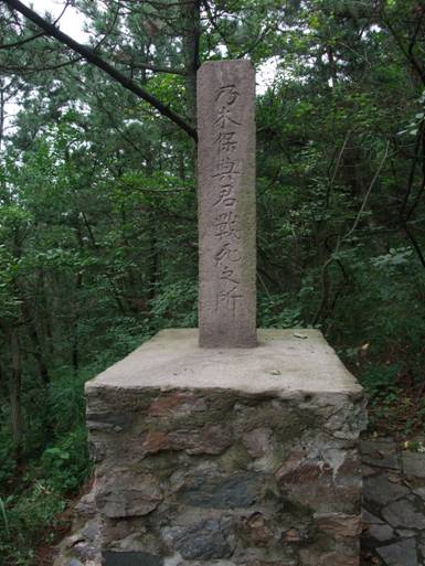 駐車場から登ってきた道とは反対側の道をたどって、私たちは駐車場まで降りることにした。この下り道から少し外れたところに、乃木希典の息子、保典が亡くなったことを悼む石碑がある。乃木は2人の息子を日露戦争で亡くしている。「乃木保典君戦士之所」と縦書きで彫った石碑は、5分程山道を下ったところにあった。この山道は。