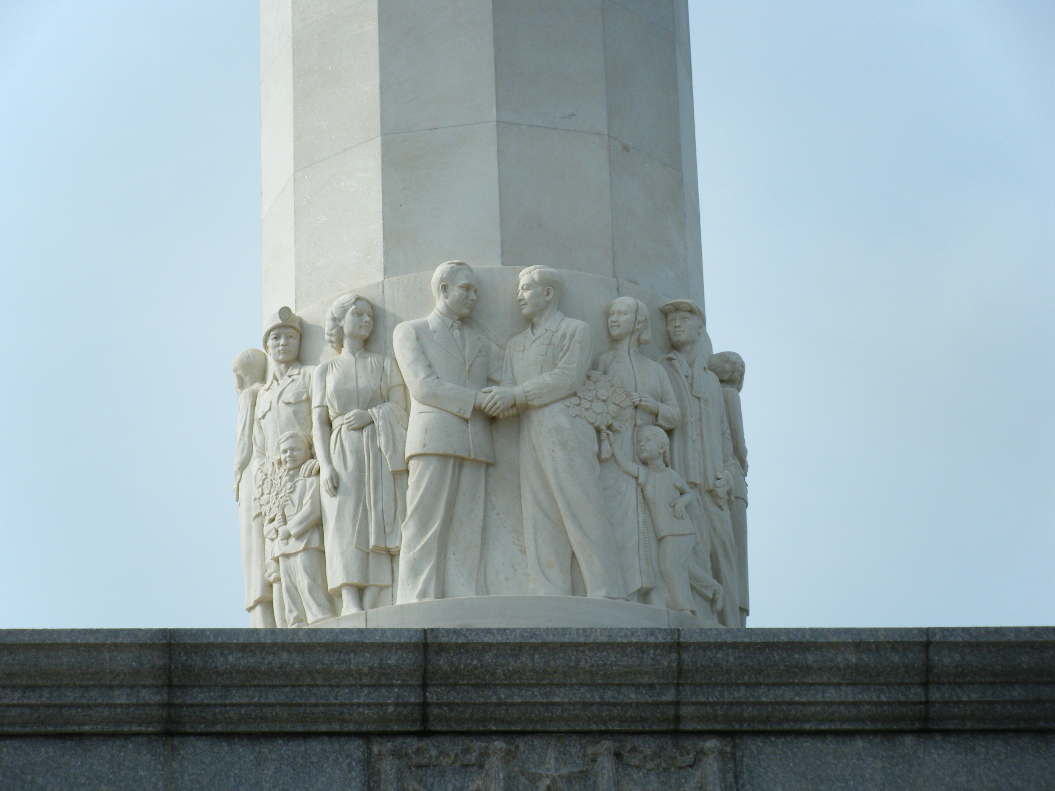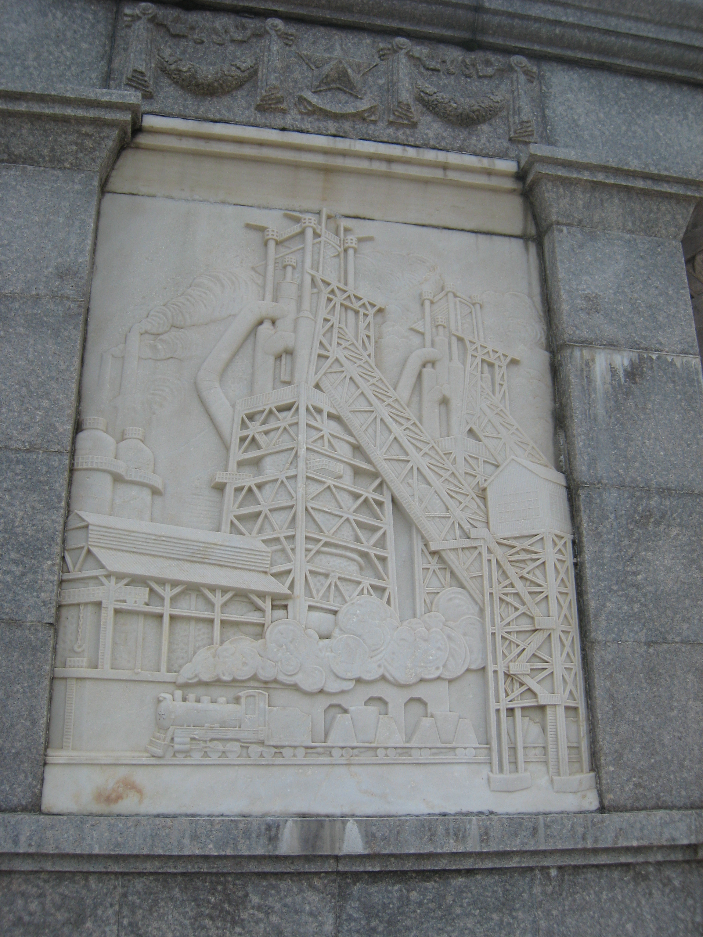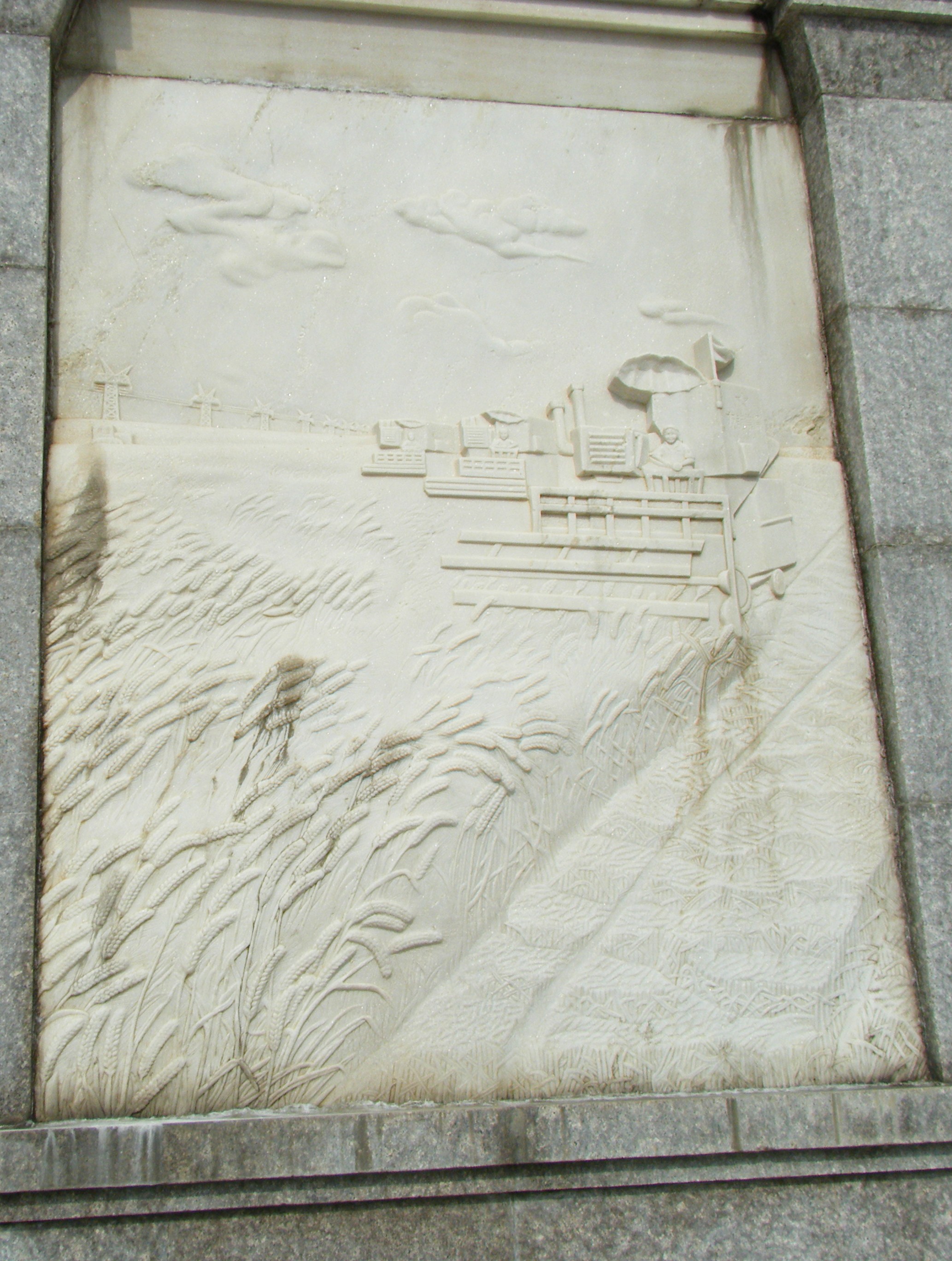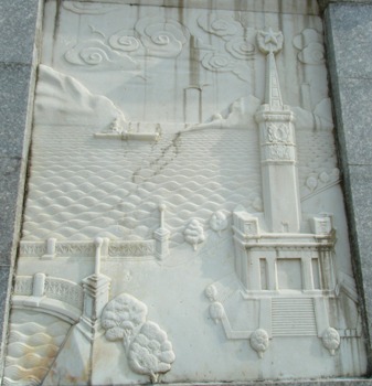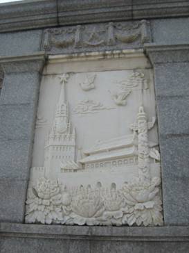 モニュメントの下から2mくらいの部分には4枚の石を彫って作った作品が四方に付けられている。これら4枚の絵も興味深い。旅順博物館の本館に面しているのが、(1)クレムリン、そこから半時計周りに、(2)鞍山の製鉄所、(3)旅順にあるソ連の勝利塔、(4)トラクターを利用した農業の絵である。