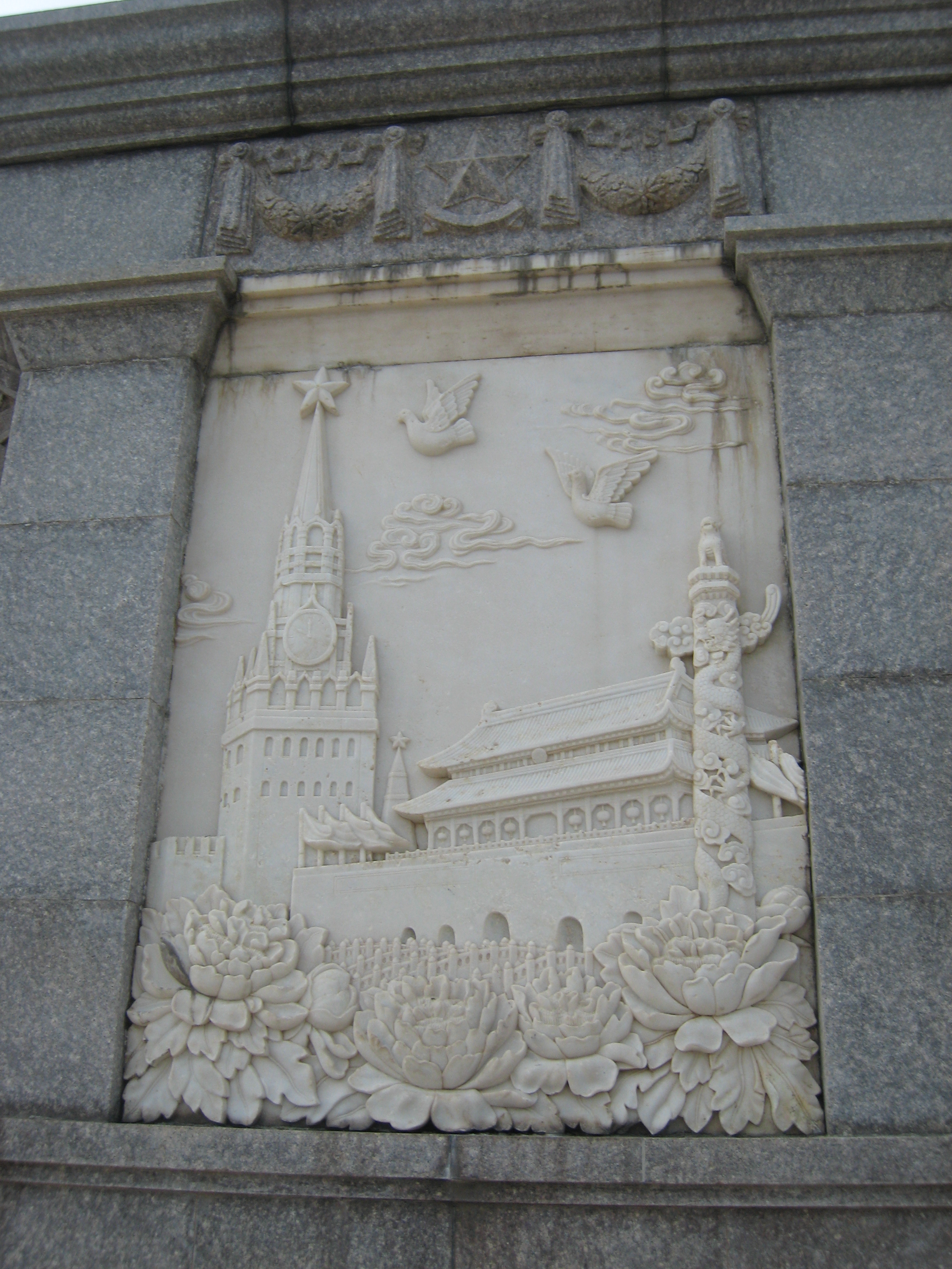 平和の象徴である鳩の下に両国の国旗があしらわれ、塔の下から3mくらいの部分には、レーニンと毛沢東が手を結ぶ肖像がある。ロシア側を代表して握手をしている人物が、1953 年3月に亡くなったスターリンではなく、レーニンであることは興味深い。