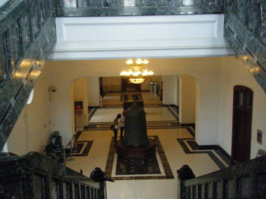 旅順博物館は、ロシア時代の将校クラブの建物で、石造りのロシア風である。内装は白を基調としつつ、細部には茶色が使われている。階段の手すりに黒い大理石、天井にはシャンデリアが飾られ、重みのある雰囲気だ。改修されているものの、建物は基本的に変わっていない。日本植民地時代には、関東軍司令部が博物館前面に建設された。
