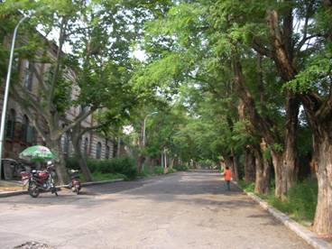 街路樹が整備され、幅員が約10mと広めにとられていて、その文明的な様相は、戦前から変わっていない様子だ。住宅と住宅の間から、現在の中国の典型的な建築様式である“社会主義住宅”の質素な建物が遠方にちらりと見え、明らかに他の場所とは違ったこの一帯の雰囲気を際立たせていた。