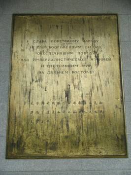 六角柱には文字が刻まれており、この文字を読もうと私たちは車を降りて、植木を貫き、塔へとつながる道を歩いていった。塔の下は短い階段がついていて、そこを登ると金の板にロシア語と中国語で書かれた碑文があった。その内容は、日本軍の侵略から中国を開放したソ連軍の功績を讃え、中ソの友好を謳った内容であった。