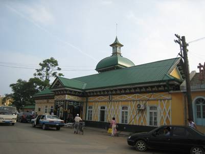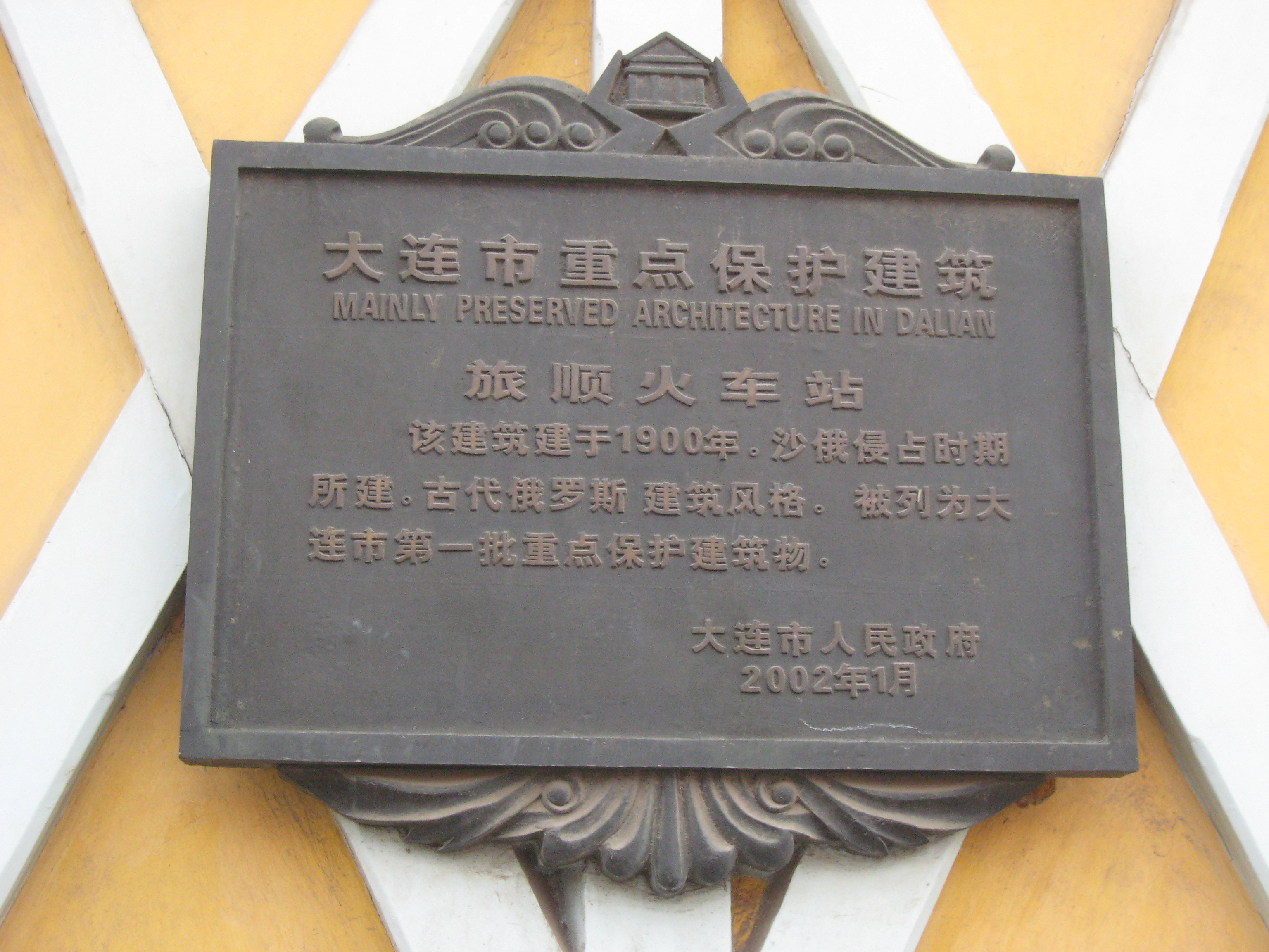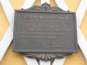 かつて日本橋と呼ばれた橋で龍河を渡ると、すぐ駅があった。作られた駅舎は黄色の壁に緑色の屋根を備えた美しいゴシック式デザインである。はっきりとロシア風のデザインを駅舎に採用することで、帝政ロシアは、旅順がまぎれもなくロシアの土地であることを象徴しようとしたのであろう。建物自体は、中国政府も積極的に保存しており、「大連市重点保護建築」に指定されていて、塗装などメンテナンスがなされている。保存に対する姿勢は、旧日本人住宅街と違うようだ。