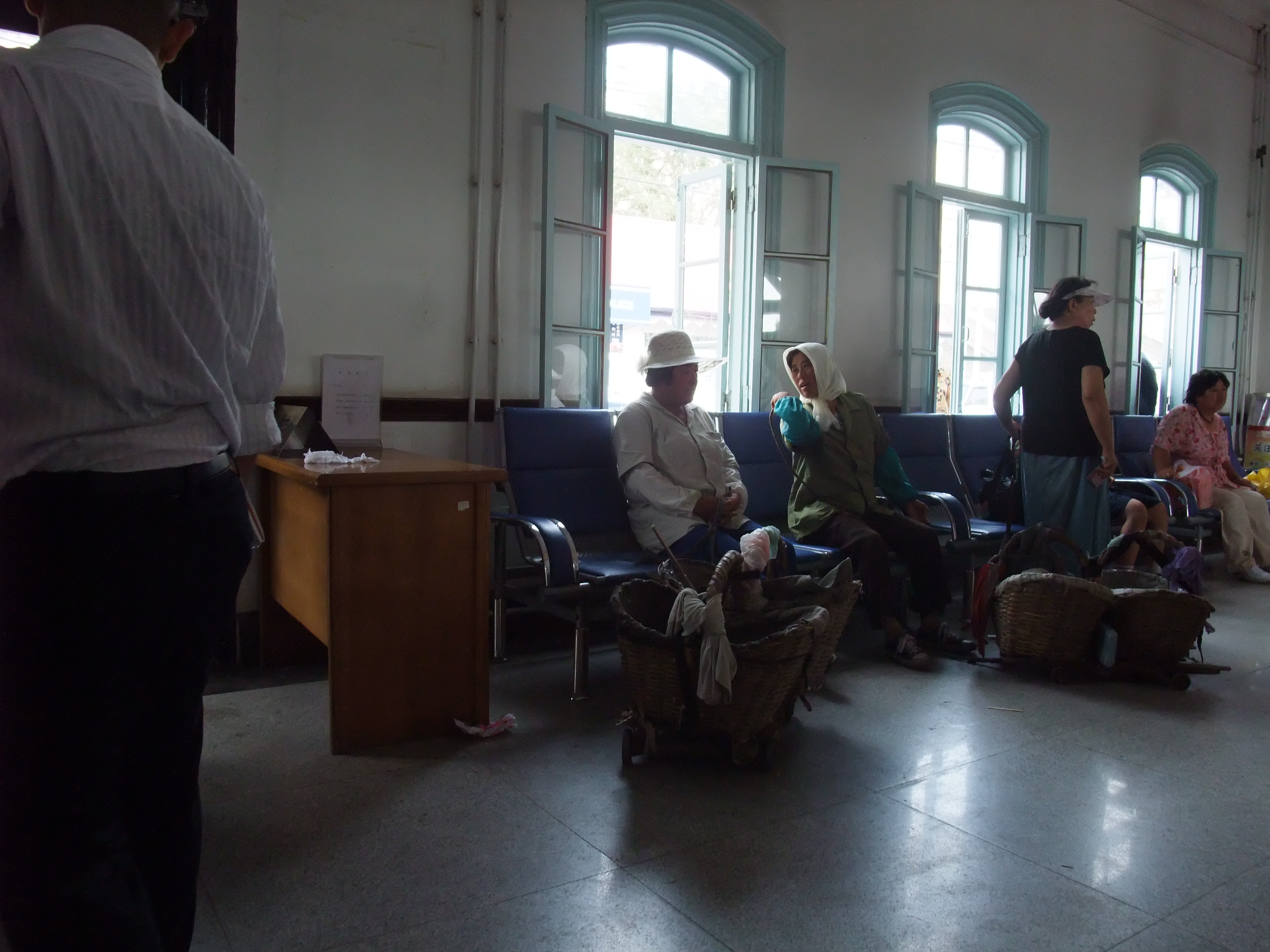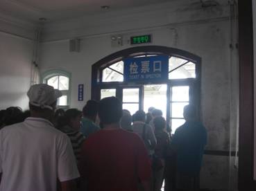 私たちが旅順駅を訪れた時間は4時過ぎで、丁度大連へ向かう夕方の列車が出発する直前であった。そのため、駅舎の中には20人程の旅客がいた。大連に列車で行く地元客も、それなりにいるということだ。旅客たちは、券売窓口に並んだり、改札に並んだりして、発車を待っている。他の旅客と比較して、明らかにみすぼらしい格好をした4・5人のおじいさんとおばあさんがいたため、彼らについてガイドのRichard氏に聞いてみると、彼らは旅順近郊の町から、旅順に日帰りで農産物を売りに来ている人達だそうだ。低所得の人々には、本数は少なくとも、運賃が安い鉄道がやはり欠かせない交通手段なのだ。