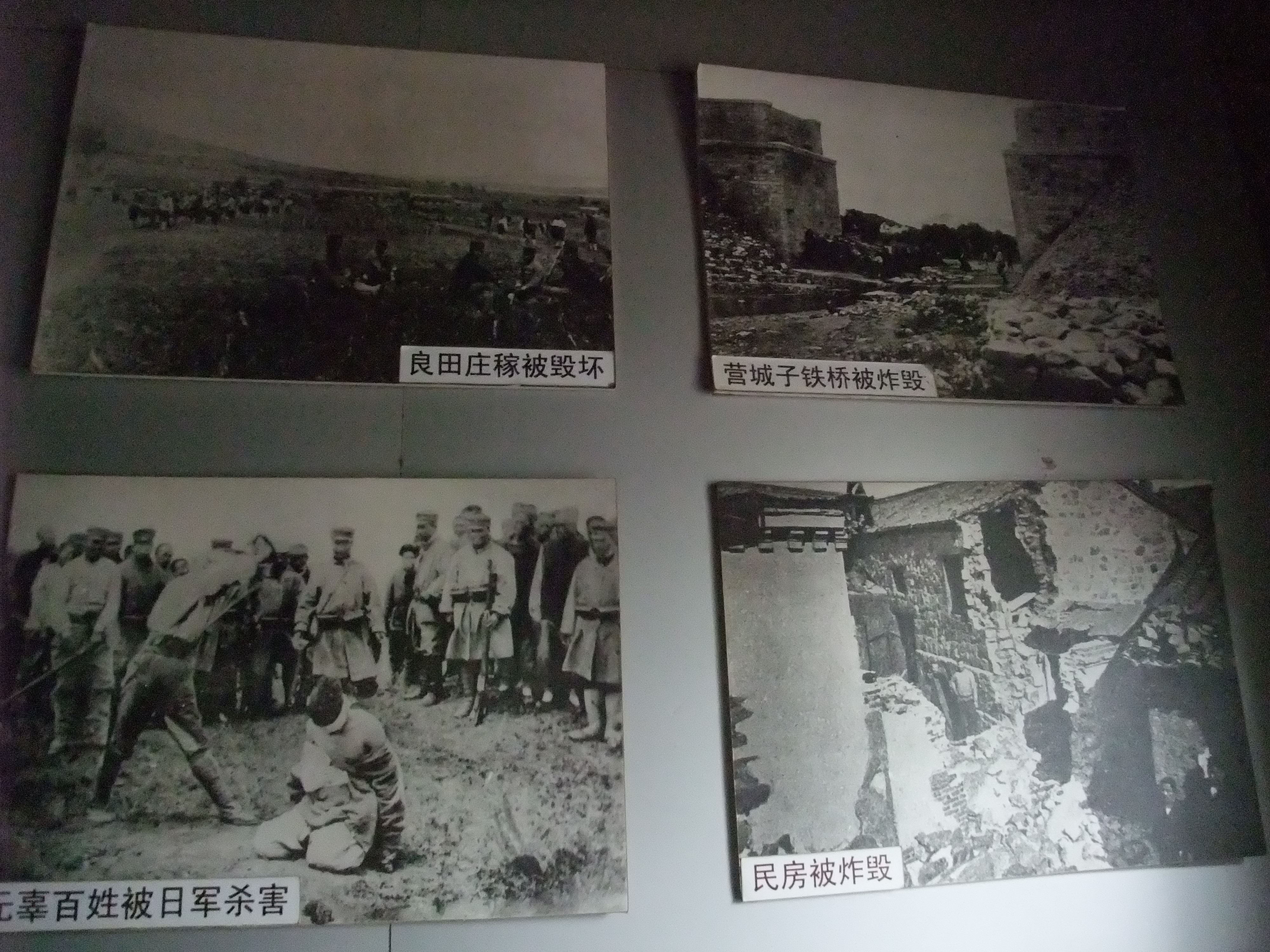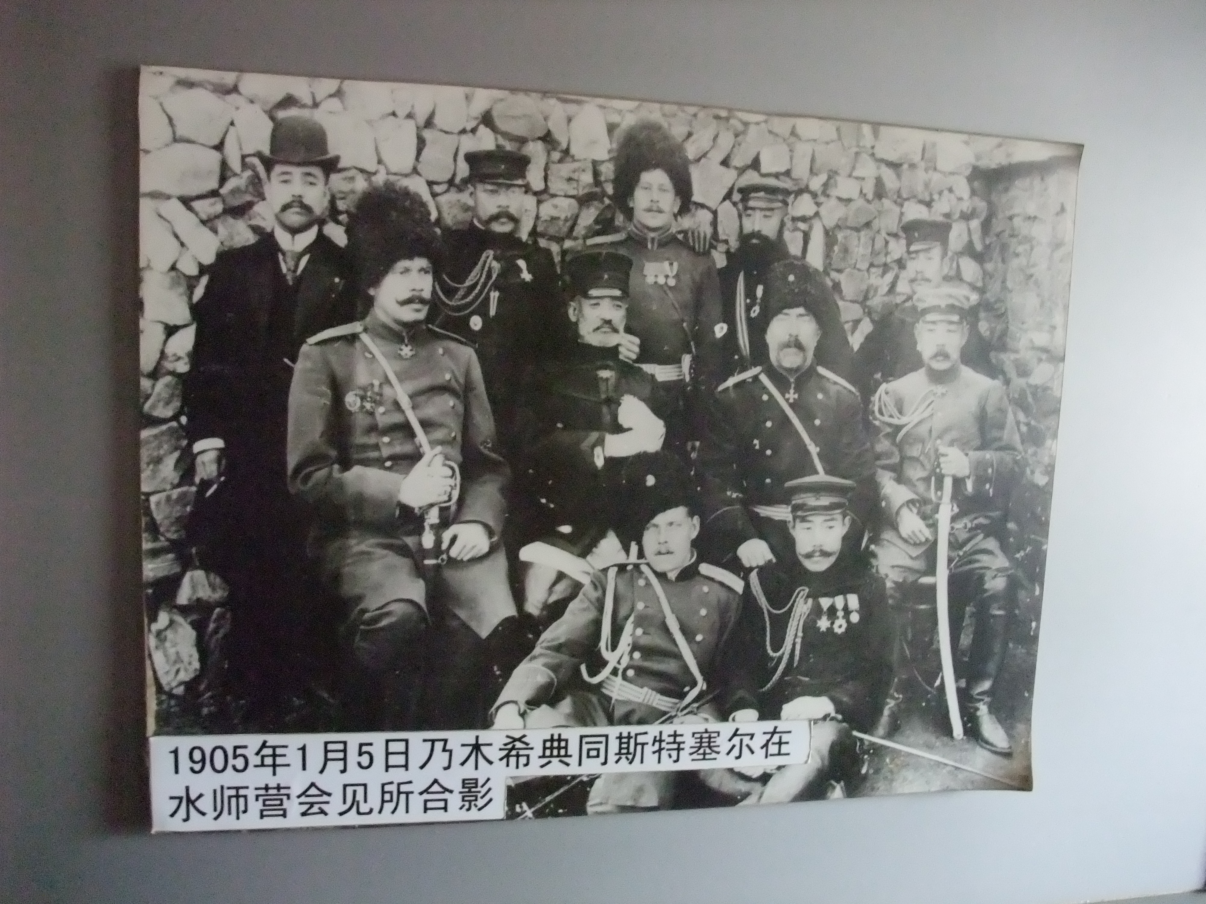 中は通路を挟んで2つの部屋があり、私たちはまず、日本軍が利用していた右手の部屋に入った。この部屋の展示品は、約20枚の写真とその説明書きである。写真は日露戦争当時の写真、水師営会見の写真をはじめ旅順の農民達に焦点を当てた写真が多い。戦争後の旅順について、中国語と英語の説明がある。説明書きの内容は、日露戦争の
