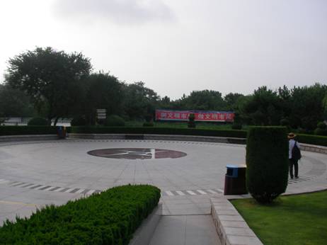 車から降りると、そこは石でできた綺麗な円状の広場であった。白い石材を切って作られた階段が設置され、「世界和平」という文字の形に丁寧に整えられた植木があって、「平和の希求」というメッセージが強調してあった。案内板も二〇三高地の案内板と字体や地図の描き方が同様で、政府が積極的に保護していることがわかる。