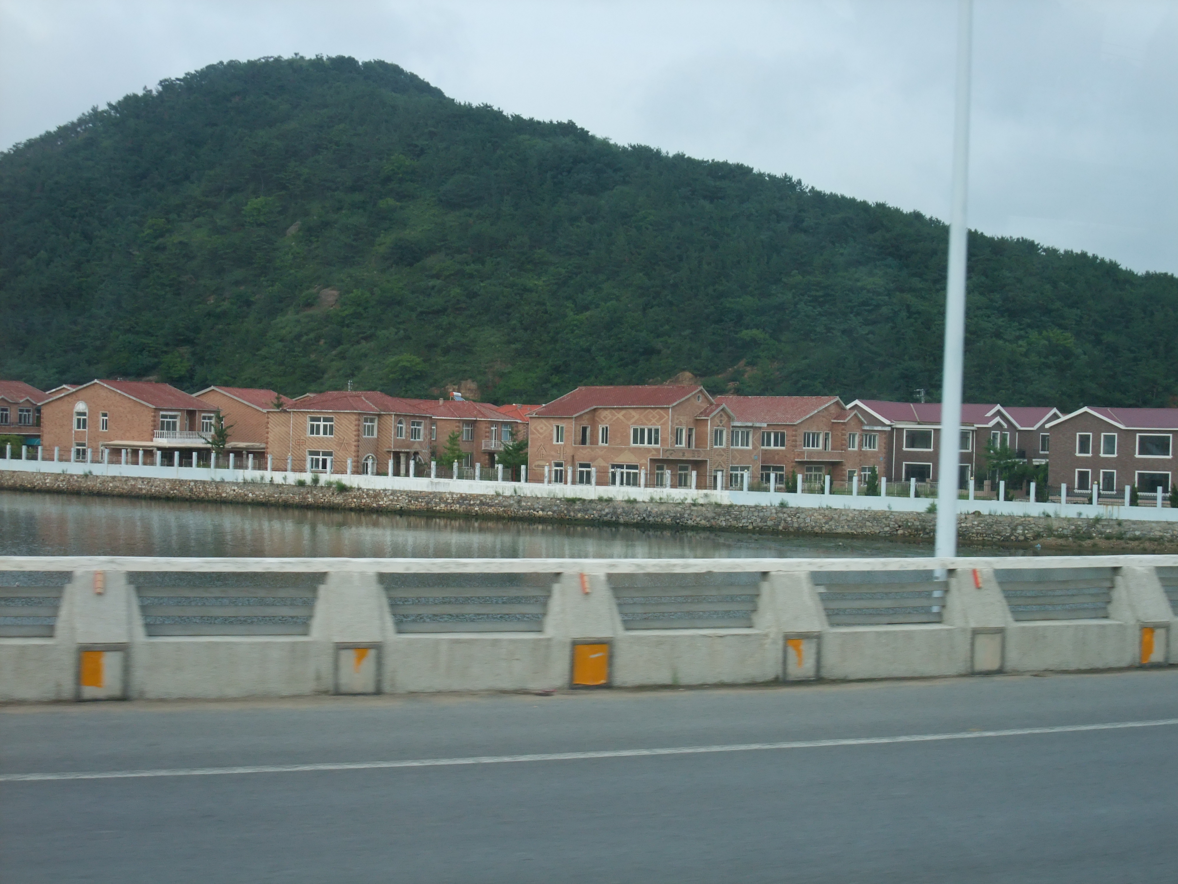 5時過ぎ、旅順の視察を終え、私たちは大連市内へと戻った。旅順からの復路は、南を走る国道201号線を通った。旅順の近くでは沿岸部を走ったが、少し旅順から離れると山と山の間を走る。道の周りには、大量の戸建て建売住宅が並んでいる。巡検を通して今振り返ってみると、これ程多くの戸建て住宅が立ち並んでいる景観はここ以外になかった。不動産バブルの追い風を受け、急速に大連の都市が拡大していることが伺える。今はまだ林になっている、道から約500m以上離れた部分にも、いずれは建売住宅が並ぶようになるのかもしれない。