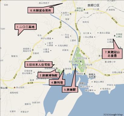 旅順は、北側が盆地状に山に囲まれ、海への出口は狭い南側の海峡しかなく、軍港としての条件が整った地形である。市街は海と扇状の山に囲まれている。このような軍事的に恵まれた地形のため、19世紀末から世界有数の軍港が築かれ、ロシア、イギリス、日本、ソ連、中国と統治者が移り変わっても、その機能は、一貫して軍港都市であり続けた。中国が開放体制を取った後も、旅順に限っては、外国人の立ち入りは、長く制限されてきた。(右図内の番号は、今回訪問した順番)