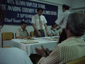 本日はこのスクールで、約60人の100期生修了式が行われた。在バングラデシュ日本大使館から経済協力担当の杉野さんがゲストに招かれ、そしてわれらが水岡教授もチーフ・ゲストとして熱烈な歓迎を受けていた。水岡教授は草の根レベルでの交流におけるITの重要性について熱弁を振るわれ、参加していたAOTS職員の方々やスクール卒業生もしきりにうなずくなど、感動していた様子であった。そして水岡教授自ら卒業生に対し卒業証書を渡していた。