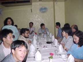 修了式の後、BAASのご好意で、同じ建物の中華料理レストランでの晩餐会に招かれた。日本の中華料理とはかなり違う味付けであったが、バングラデシュに着いてからもっぱらカレーだったわれわれには、良い気分転換となった。晩餐会では、BAASのフセイン代表が、バングラデシュのNGOのあり方について、BRACなどのように商業化して利益を追求するのではなく、草の根からの援助を続けるべきだとのと指摘をされた。また、日本の援助のあり方について、いくつもの手厳しい批判が出席者の間から出された。例えば、援助対象が依然として相手国政府中心であって、BAASやNGOのような団体に直接援助を行って効果をあげるという点において他の欧米諸国に大変立ち遅れている。また、援助プログラムが、すでに存在する経済部門に対するだけのステレオタイプ化したものとなっており、例えばバングラデシュならば輸出産業としてすでに実績在る縫製業だけを見てしまう。そもそもこの縫製業は、韓国企業が従来何もなかったところに興したものであったが、こうした韓国のような先見的・長期的方針は、日本にない。最近は、ODAの削減等の理由により、援助が中国など関係の深い国に偏る傾向があり、バングラデシュへの援助が減っていて、むしろバングラデシュでは、韓国のプレゼンスがより多く目立つようになってしまっている、などである。