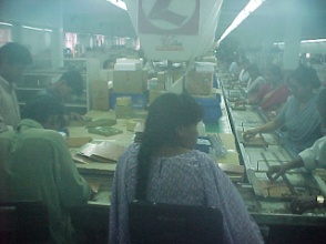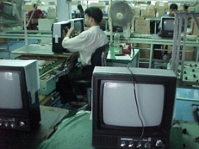 この工場のテレビの組み立ては、プロダクトサイクル論で言う成熟産業の生産過程を地で行くようなものだった。生産は、完全にマニュアルに従って行われている。CPT(カラー用ブラウン管)やCRT(白黒用ブラウン管)など原材料は、かつては日本や香港から輸入していたが、近年は高額になったため、すべてインドから輸入するようになったという。ちょうど自作キットのように、部品一そろいがパッケージでインドから供給さて入れるのである。工場内は、薄暗く、クーラーも無いため暑かった。組み立ての流れ作業では、女性工員が基盤への部品挿しこみを行っている。動力コンベアはなく、一つの部品挿しこみ工程がすむと、そこの職工が、次の工程に、人力でシャシーの乗ったレール上の台を押してやらなくてはならない。