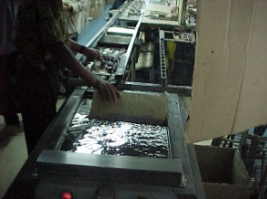 中でも驚いたのは、挿しこんだ部品を基盤にハンダ付けする作業を、手に基盤を持ち直接溶けたハンダ液に漬けていっていたことである。溶けたハンダからは錫と亜鉛が気化した重金属ガスが絶えず発生しており、そばを通っただけでも我々は少し気分が悪くなった。所が、そこの男性従業員は、簡易なマスクをしただけでこの作業に長時間従事していた。換気装置も、十分なものが設置されているとはいえない。重金属ガスが建物全体に漂わないようにするため、簡単なダンボールで作った庇のようなものしかなく、ガスはライン上の女性工員のほうにも漂ってゆく状況である。従業員の安全があまり考えられていないようだ。