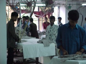現場では、型紙、裁断、ミシンによる縫製、襟袖、アイロンがけ、ごみ除去、といった風に工程は細分化され、流れ作業を行っていた。機械は、ミシンが日本のブラザー工業製品であり、製品の糸くずを除去する機械は、次に訪問するModern Erection Ltd.(下記参照)の国産品であった。完成品のサンプルはアメリカの買い付け業者に送られ、ボタンの位置やポケットの縫い方など、サンプルにぎっしりと直接マジックで英語の指示が書かれてあった。クレームと訂正要求が書かれている型紙もあった。また、印刷された注文書にも、「seams13-14stiches