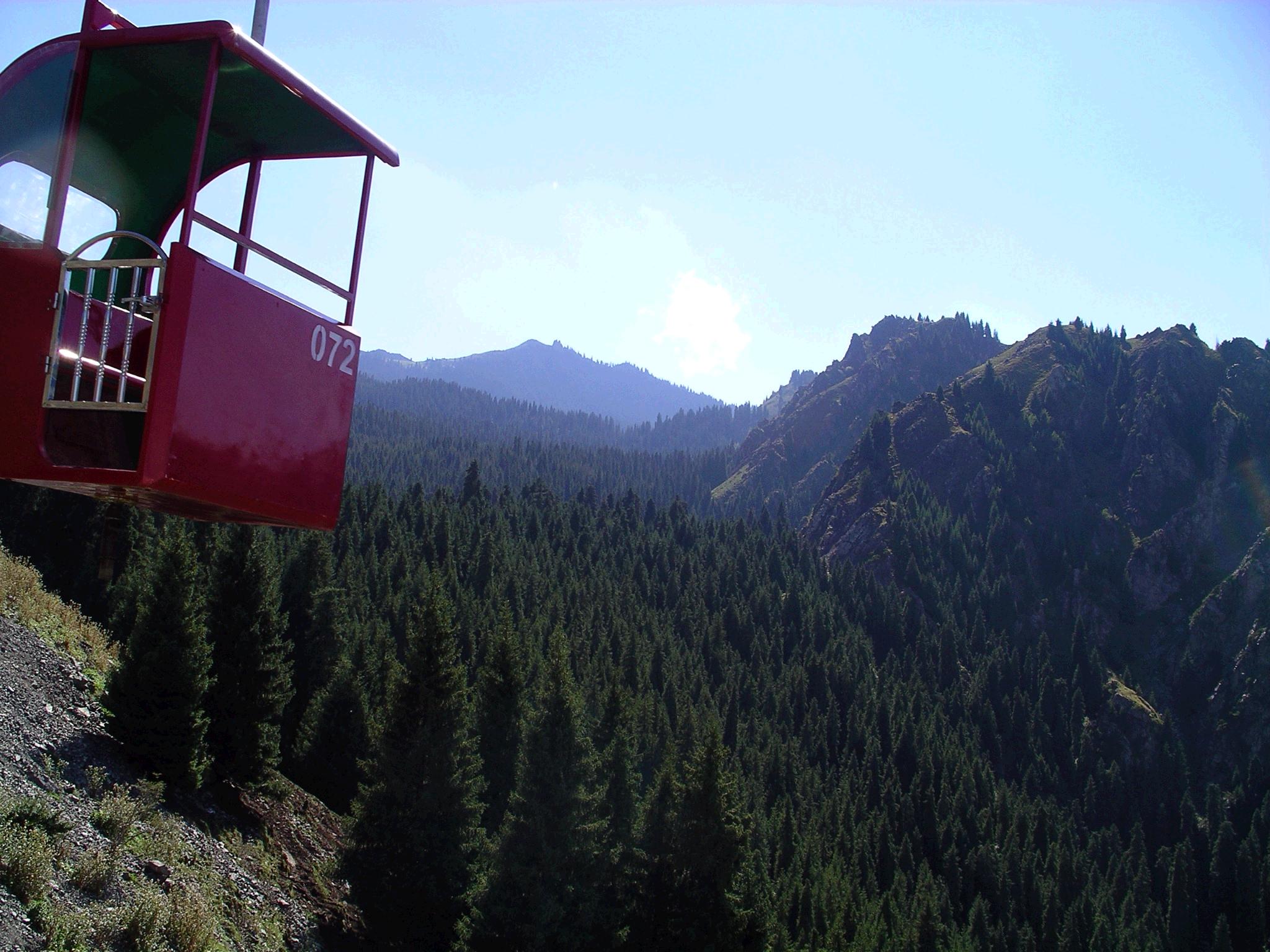 天池へは、徒歩で登ることもできるが、われわれはゴンドラリフトを利用した。料金は、ここでも25元(約375円)。入山料と、ゴンドラリフトの料金の一部は「新疆昌吉回族自治州地方税務局」というところに収められる。この料金の一部は、観光地整備・保存に使われているのだろう。けれども中国で60元は一般的な感覚ではかなり高額な値段なので、本当にお金のある人しか入れないのではないだろうか。ここは、東部から来る漢民族や海外からの観光客向けの観光地なのだろう。ちなみにこのゴンドラリフトというのは、二人乗りで、囲いも何もなく、横がむき出しになった、むしろスキーリフトに近いものである。けっこう乗っている時間が長く、しかも、深い谷をはるか下に望む高度感のある場所を通るので、高所恐怖症の人にはお勧めできない。だが、そうでない人には、気持ちのよい風も感じることができて、とても爽快だった。