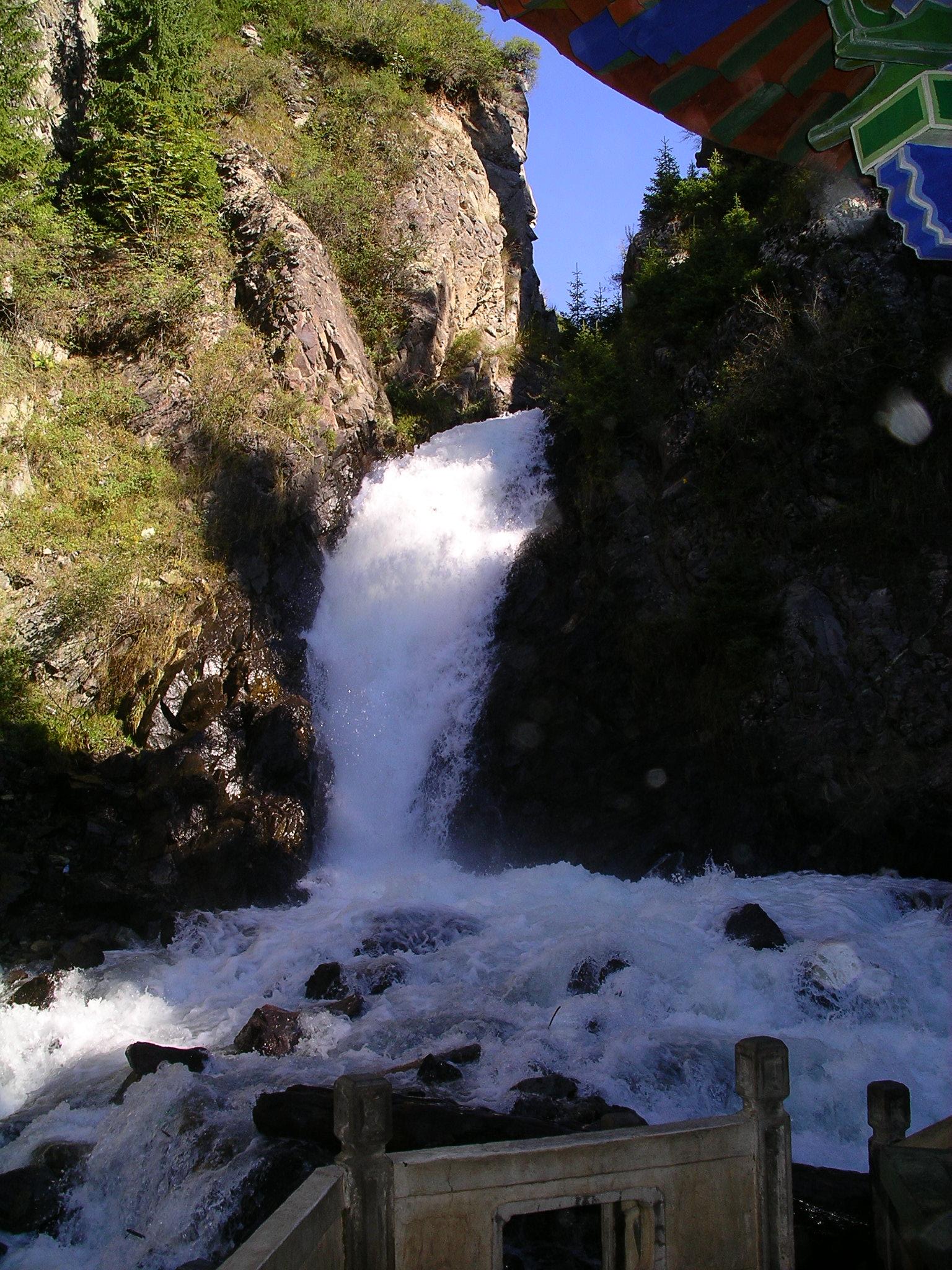 湖の周辺をトレッキングし、清朝の時代に政府が天池の水を灌漑用水に利用しようとして作った水路にできた人工の滝にたどり着いた。これは、農業をしない現地民である遊牧民族のカザフ族にはもともと不要なものだった。この滝は、農耕民の漢民族の侵出を物語るものにほかならない。滝を間近で見られるように川から滝まで小さな橋が架けられており、滝の正面には漢民族的な、朱色の瓦屋根のちょっとしたあずまやがあった。この屋根と滝を背景にして、中国人ツアー客のおばさんたちはみんなで写真を撮り合っていた。彼女達にとっては単なる写真スポットに過ぎないのだろうが、実は先述のような、この地域の中国による支配という、象徴的な場所でもあるのだ。