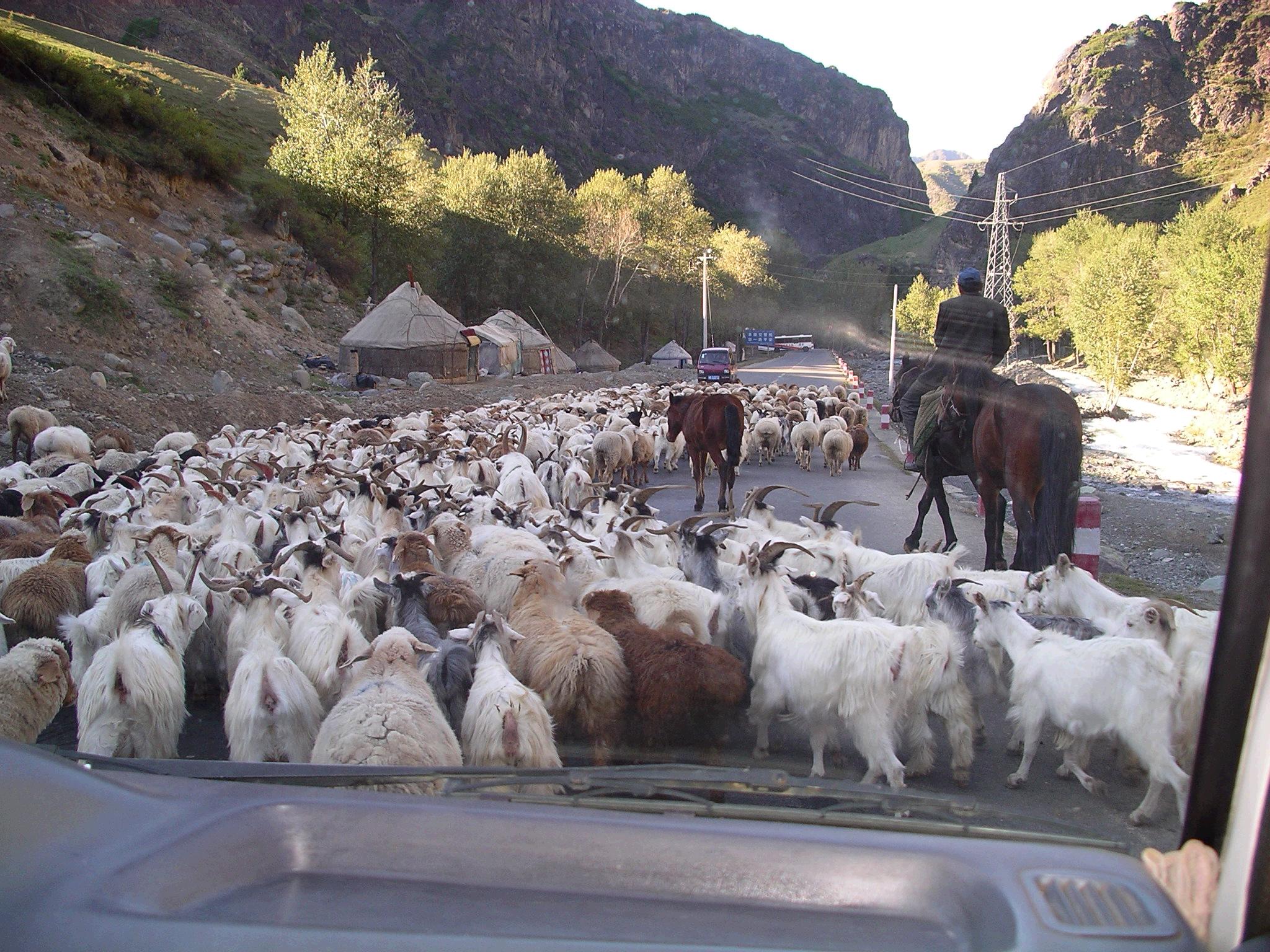 車は高速道路を下り、天池に向かう道に入った。天池に近づくにつれ、牛、馬、羊、山羊など放牧されている動物の姿が見られるようになり、カザフ族のテントもぽつぽつと現れてきた。植生の変化も顕著で、高速道路の周辺は礫砂漠、高速を抜け高地へ近づくと草原、そして山林、と緑が増えてきた。