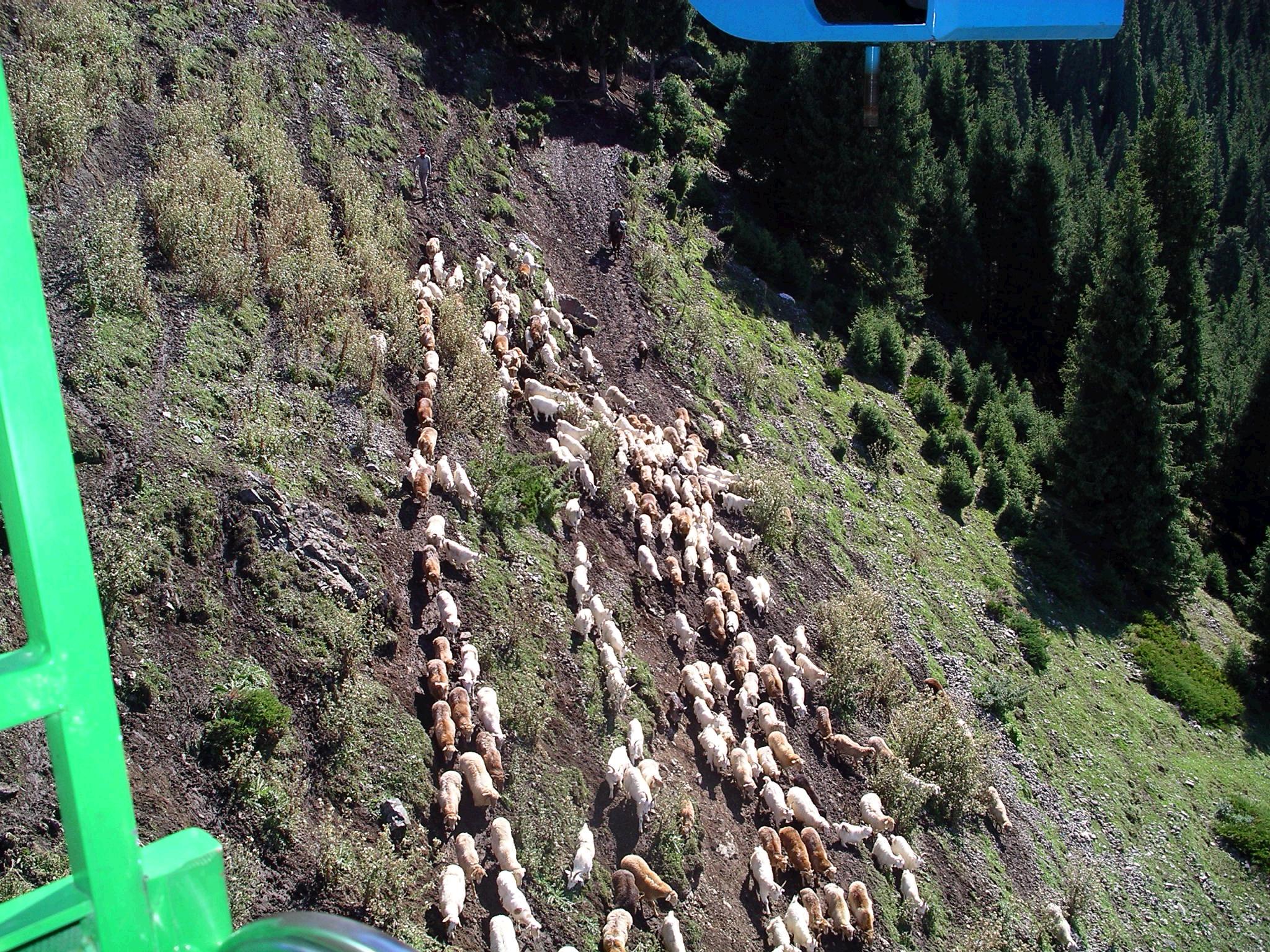 眼下に見える斜面を放牧中のカザフ族の男性が何十匹もの羊を追って駆け下りていく。天池は現地の人々の生活の場でもあるのだ。ただ、今後天池の観光開発が進むと、このような人々がここから追い立てられてしまう可能性もあるのではないかと思う。また、その斜面には、植林の跡が残っていた。観光地化されてしまった以上、人工的に自然を管理していかないと、環境保全ができないということだろう。