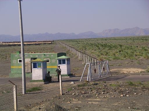 カザフスタン側に入るとすぐに、監視塔と管理所のような建物が見られた。そしておそらく、ソ連時代に作られたものと思われる黒くて古いフェンスと、独立後に作られたと思われる白くて新しいフェンスが二重に張り巡らされた地域に出た。ここは、阿拉山口からわずか4km先にある、カザフスタン側の国境の町、ドスティックの少し手前である。