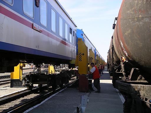 ここで台車の乗せ換え工事を行う。旧ソ連内の線路は広軌、中国は標準軌であるため、中国の台車ではこれから先には進めないのだ。ここで線路の軌道(線路の幅)について簡単に説明を加えておく。一般に軌道は広軌・標準軌・狭軌の3つに分類される。日本の場合、新幹線が標準軌(1435mm)で在来線が狭軌(1067mm)である。中国は前述のとおり日本の新幹線と同じ標準軌で、一方ソ連では広軌(1520mm)となっている。そのため、客車をジャッキで持ち上げて、広軌対応の台車に乗せかえる必要があるのだ。