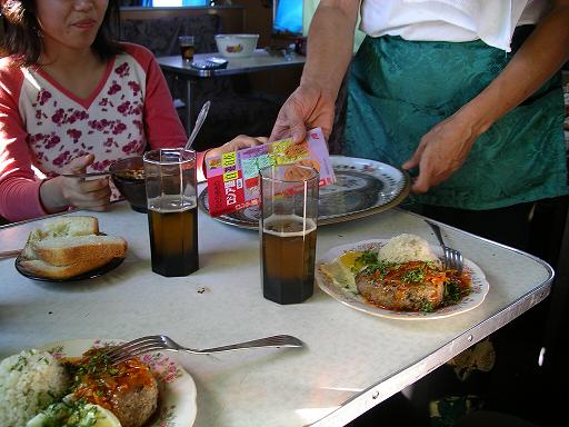 食事を済ませ、会計をしようとすると、金額が異様に高額でびっくりした。会計伝票を見せてもらい確認したところ、隣の席のカザフ人が飲んだビール代や、吸ってもいないタバコ代が含まれていた。「ここはレストランだから高いのよ!」と言い続けていた食堂車のおばちゃんも、「ごめんごめん、間違えていたわ…」と言って非を認めた。故意だったのか過失だったのかは分からないが、高すぎると思ったら確認してみると良いかもしれない。カザフテンゲを持っていないので、中国元で支払った。食堂車でのレートは(1元=16テンゲ)と駅よりも悪くなっていた。