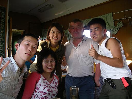 この列車は中国の車両である。車両のインテリアは全体的に明るく、全体的に清潔、奇麗で好印象の持てる列車だ。客車のボディには「硬臥車」の表示があるが、内装は完全に「軟臥車」であり、4人で1つのコンパートメント(2段ベッドが2つ)となっている。廊下には案内の電光掲示板、そして各部屋には冷房が付いている。その立派な旧ソ連領共和国に乗り入れる国際列車に国の威信を賭ける中国の意気込みがひしひしと感じられる。しかし冷房は風量調節ができず、あまりの寒さにガムテープで噴出口を塞いでしまった。ガムテープは、こういうとき何かと役に立つ。またシーツや枕が備え付けられており、これらの使用料は運賃の中に含まれている。