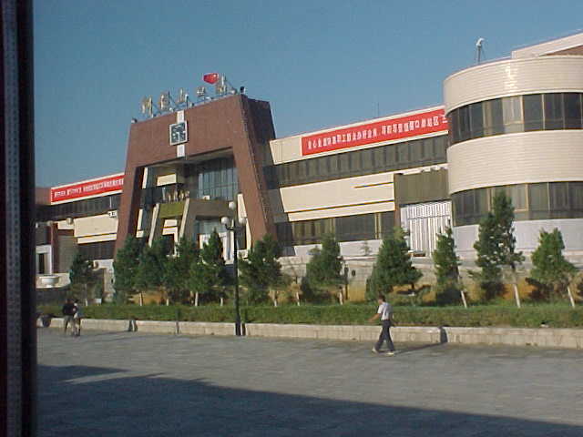 車外に出ることはできなかったので窓から眺めると、町はかなり発展しているようだ。「鉄路大酒店(ホテル)」をはじめ大きな建造物が幾つか見えた。看板や横断幕は基本的に中国語(漢字)表記だったが、中にはロシア語(キリル文字)でルビが振られているものもあった。異様に大きなパラボナアンテナがある。駅には、「新鉄快速」と書かれたトラックが何台か停まっていた。これは、中国でトラック運輸サービスを行っている中国企業の名前である。