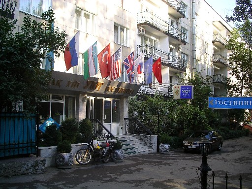 まずわれわれは、アルマティで宿泊するウユットホテルへ向かった。ホテルは駅から15分ほどの市内に位置する。だが、まわりを見ると、そこは旧ソ連の国営住宅地区そのものだった。ホテルの建物の外見も、まさに国営住宅である。要するに、1階の商業利用とおなじ過程で国営住宅が民営化され、改装されてホテルとして営業しているのである。ロビーは薄暗かったが、床全体に大理石が使われており、ここでもどことなくヨーロッパ風の印象を受けた。われわれの宿泊したホテルに隣接してもう一軒ホテルがあったことから、旧ソ連時代の国営共同住宅を改装してホテルにするのはこのあたりでは一般的なビジネスモデルなのかもしれない。ホテルの周辺は現在でも集団住宅地として利用されており、子供の遊ぶ姿が見られた。