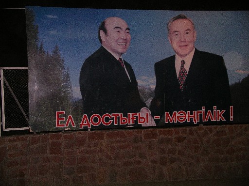 夜11時過ぎ、われわれは国境についた。国境には、カザフスタンのナザルバエフ大統領と、アキルギスのカエフ大統領が並んでいる大きな看板が立っており、両国の友好関係を強調していた。