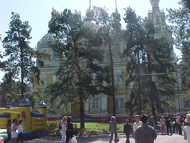 まず正面にロシア正教のゼンコフ教会がある。ガイドの話では、これはすべて木製で、一本も釘を使わずに建設されたそうだ。その割には非常に大きく、2度の地震にも耐えたということだったので、今まで木造建築は日本のお家芸だとばかり思っていた私は、旧ソ連にも素晴らしい木造建築技術があることに感心した。内部は聖母画をはじめとする宗教画が天井も含む壁一面に描かれており、われわれを圧倒した。現在では実際にミサや結婚式も行われるということだったが、旧ソ連支配時代は閉鎖され、自由な宗教活動が規制されていたという。