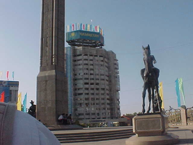 その後独立記念広場を訪問した。ここには以前、レーニン像が立っていた。レーニンは、いうまでもなくソ連統一の中心的イデオロギーの象徴である。広場自体は1980年に作られ、独立記念塔は独立後の96年に完成した。広場は知事府の正面にあり、かなり大きかった。独立記念塔の先端にはゴールドマンのレプリカがシンボルとして飾られ、太陽と空を表したモニュメントがその周りを囲んでいた。この独立記念広場は、民衆の集会・パレードの場として旧ソ連時代に使われており、1986年にモスクワの共産党中央委員会からの命令で民衆の同意を得ることなくソ連カザフ共和国のリーダーをロシア人変えるという事件があったときには、大規模な反対運動が行われたそうだ。