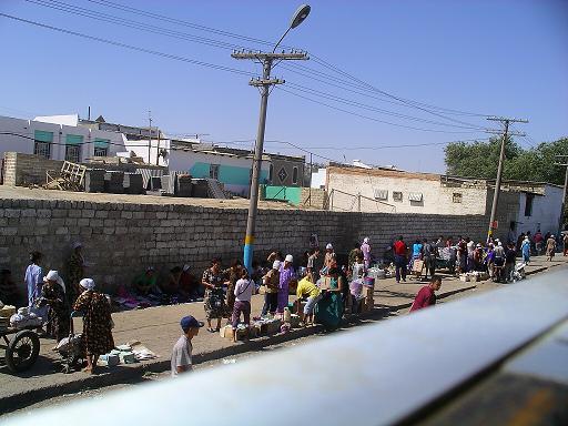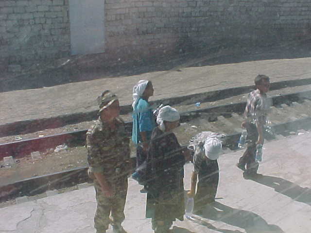 検査のため2時間停車しているあいだ、客車内に風が入ってこないので、蒸し暑くてたまらない。この列車には、エアコンが全く付いていないのだ。周りにいた現地の乗客も裸足、上半身裸になって涼んでいた。窓の外には商人がたくさん集まってきており、乗客が客車から外に出られないので、窓からお金を落として商品を投げ上げてもらう形で商売をしている。われわれは、ペットボトル入りの水を買った。水は冷凍庫でカチンカチンに凍らせてあり、この暑さに大変ありがたかった。なかなかいい商売のアイディアを考え出したものだ。他に、焼き魚・ナン・サラダ(といっても数種類の野菜が袋に入っているだけ)を買って食事にした。駅売りの商人たちはラジカセ・VCDプレーヤーといった電化製品や衣類も販売しており、乗客の中には、それらを買う人の姿もしばしば見られた。自分で使うのだろうか。それとも、タジキスタンのバザールで売って金を稼ぐのだろうか。