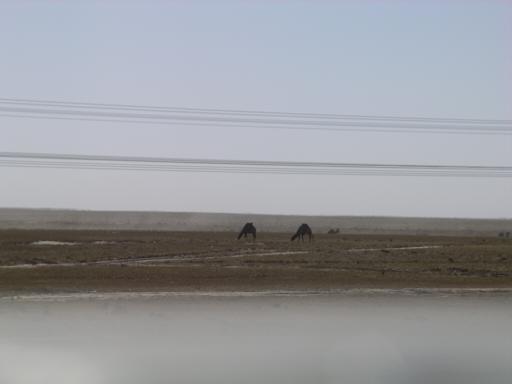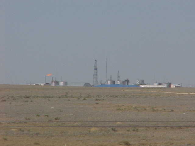 しばらくして目が覚め、窓の外を眺めると、アティラウ出発直後に生えていた草地はなくなり、列車は砂漠の中を走っている。雨が降ったときにだけ川や池になるような場所が乾燥して塩の河・池になっている光景が点在している。進行方向の右手側、カスピ海方面に、油井と、廃ガスを燃やしていると思われる炎が見られた。テンギス油田もある方角である。線路沿いには道路は見られなかったが、電線は張られていた。