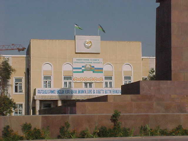 その後自治共和国の議事堂広場を訪問した。ここにはカラカルパクスタン共和国のスローガンが大々的に掲げられていた。ウズベク語で読むことができなかったのだが、ガイドに英語に訳してもらい、"Our children should be wiser than us"(我々の子孫は我々よりも聡明でなければならない)という意味だとわかった。これは、旧ソ連時代の著名な作家からの引用であり、ソ連時代の思想が今も息づいていることがうかがえた。議事堂の正面には、カラカルパクスタンの国章(星5個)、ウズベキスタンの国章(星14個)が並んでいた。