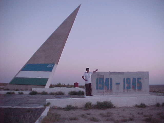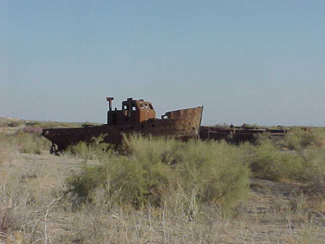 アラル海は、綿花栽培のための灌漑用水が原因で、アムダリア川Amu Darya およびシルダリア川Syr Daryaから注ぐ水量が減少し、現在湖面積が急激に縮小している。空が白み始め、われわれは車を降りて、切り立った崖の上へと向かって歩いた。そこは、かつての湖畔であったが、今では湖面は200キロ先にまで後退してしまった。崖の畔には第二次世界大戦の勝利を記念した大きなヨットのようなモニュメントが建っている。崖のそばの急斜面を30メートル程降りると、かつてアラル海の湖底だったところを歩くことができた。白く美しい貝殻が散在しており、そこがかつて湖底であったことは疑いようもない事実なのだが、現実に目の前にしている光景は、荒廃した砂漠だった。「アラル海」ならぬ「アラル砂漠」には、表皮が硬く白い、いかにも砂漠に生えていそうな植物が至る所に根を下ろし、植生も完全に砂漠と成り果てている。降り立った場所から数百メートル離れたところにはなぜか電信柱が建ち電線が走っており、このような場所にまで社会的インフラをきちんと整備する旧ソ連の社会主義政策の律儀さに、妙に感心させられた。
