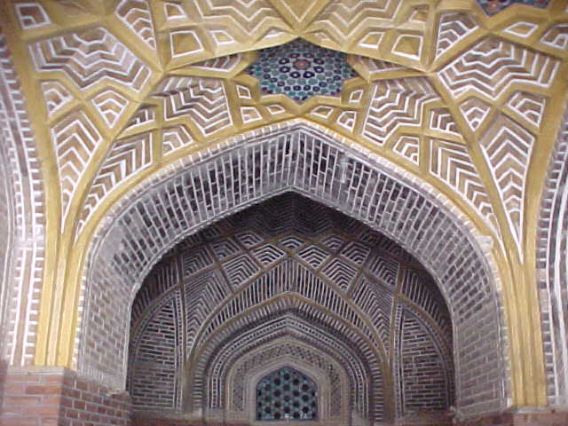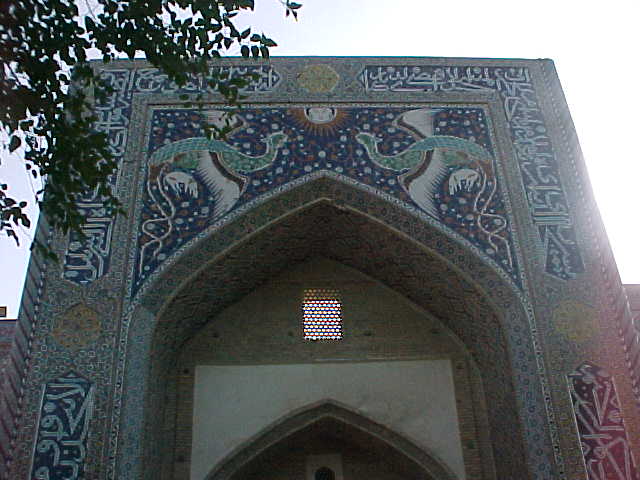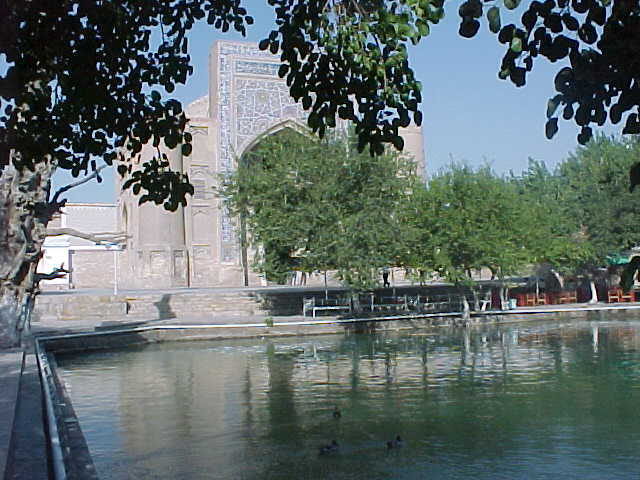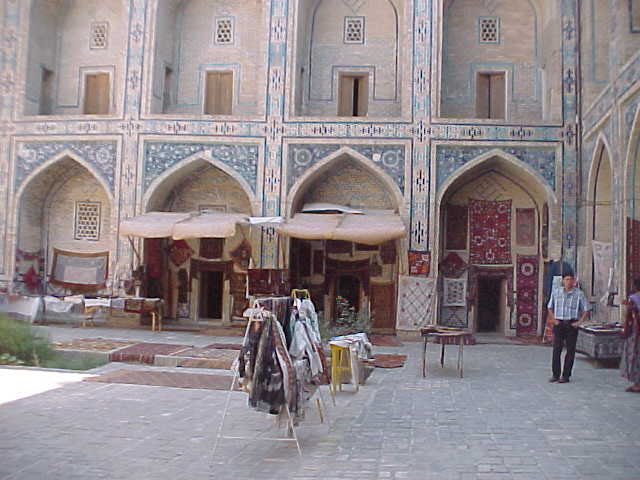 次に、この庭園の東側に聳え立つNadir Divanbegi Medressaの中に入ってみた。すると、びっくりした事にマドラサの内装がじゅうたんでほぼ覆い隠され、みやげ物屋でマドラサの中がいっぱいになっていた。マドラサの中には、ゆっくり朝食をとったり、チェスを楽しんでいたりしてくつろいでいるブハラの人々もいた。ブハラ市民にとってマドラサは、学校ではなく、土産物を売る場所であり、また休息場所になっていたのである。これは、政府がマドラサの保存に積極的でなく、本来のイスラム思想を教育する場として機能させないようにしている姿勢の現れである。ウズベキスタンでは独立後、イスラム原理主義の影響が強まり、イスラム教の振興に必ずしも熱心でない政府への暴力的な攻撃が頻繁に起こっている。政府と異なる権威の根源であるイスラム教を教育する機関に、政府は消極的であり、そのマドラサの解体を目指しているのかもしれない。私は、イスラム教徒への教育の場としての古き時代のマドラサの様子を見たかったが、現実はそれとは違っていた。