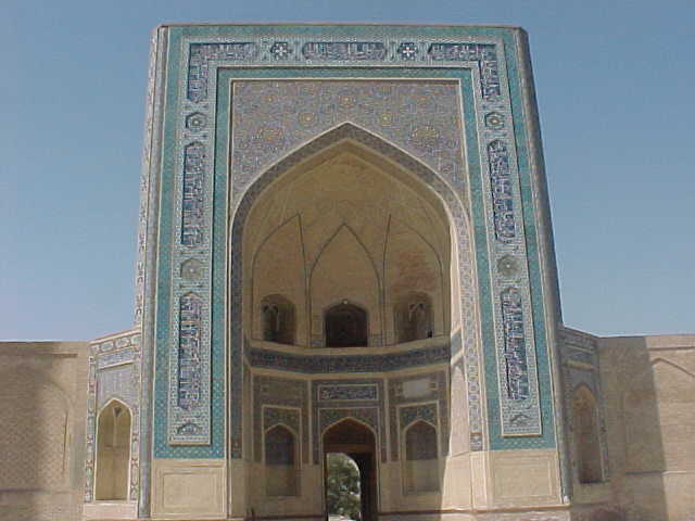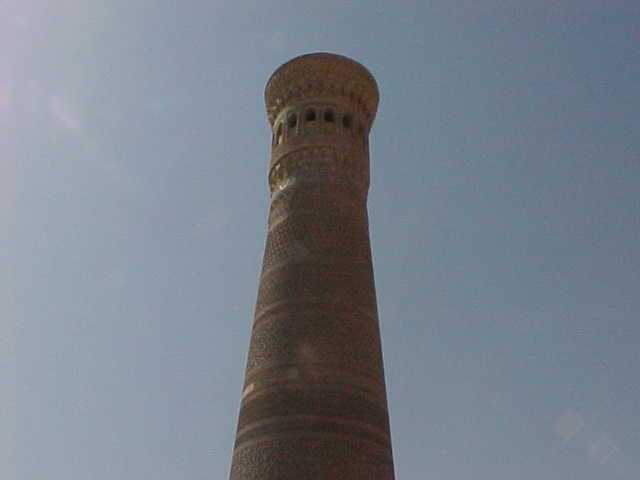 カロンモスクは、1114年に建設され、チンギス・ハンによって破壊されたが再建された。ソ連支配下には倉庫として使用され、独立後は再びモスクとなったもので、保存状態のよさは中央アジア随一である。カロンモスクの中に入ったとたん、4,5人の黒スーツのガードマンが現れ、あたりを厳重に見張っているのが目に入った。いったいどうしたのかと思いつつ、中に入りモスクの内側の庭園に入っていった。モスクの内部の庭園には、土産物屋など余計なものは一つもなく、静まり返っていた。しばらくすると、自分のサイドとは反対側から、たくさんのSPをひきつれたVIPらしき人たちが現れた。彼らはモスク内をしばらく見るとすぐモスクから出て行った。彼らが出て行ったあと、ガードマンに「奴ら何もんや?」と尋ねると、ガードマンは「マレーシア国王です」と答え、足早に立ち去っていった。なかなかいいタイミングにはちあわせたなと思い、モスク内をみてまわった。