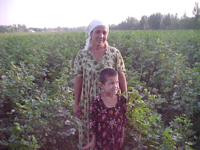 ブハラからサマルカンドに至る270kmの道の途中、遠くにはナヴォイの工業地帯が広がり、沿道には一面の綿花畑が広がっていた。その畑で、45歳のムヤサル(Muyassar)さんとその子供3人と出会い、その人達から話を聞くことができた。