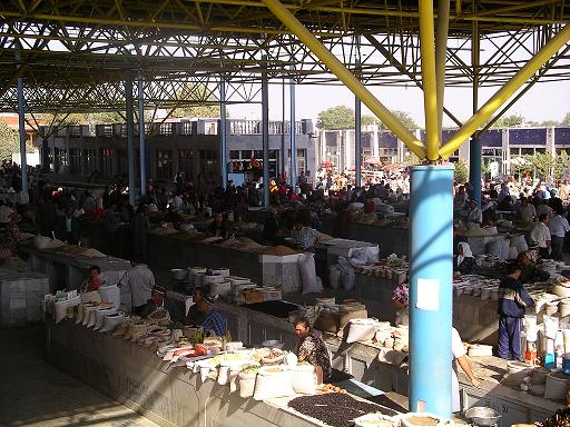 その後となりのバザールへ。タシケント通りの西側は主に食品、東側は主に石鹸や文具などの生活雑貨と服・靴・布を扱っていた。女性の着ているゆったりとしたワンピースはほとんどが自分で布を買ってきてつくったものであり、既製品はほとんど売っていない。既製服は西洋風のいわゆる「洋服」のみである。こんなに観光地のどまんなかにあるにもかかわらず、東側に日本人観光客はほとんどいなかった。西側にはまばらにいたものの、それでもやはり遺跡などで見かけた観光客の数を考えると、かなり少なかったといえる。アルフは、「日本人はほとんどツアーでくるが、ツアーではあまりバザールには来ない。みんなもっと高い店で食事をして高い土産屋に連れて行かれて高い土産を買って帰る」と言う。バザールは、地元の人でごったがえしていた。値段も、観光地用ではなくふつうの地元民用で、特に東側ではバザールの店主たちが英語も日本語もひとことも話せないことが多く、意外であった。わたしは布屋のおばちゃんに、「キルギス人か?」と言われた。私はここで寝るときに床に敷く、横の長さ約140cmの布(じゅうたんではない)を購入。1m当り1500スム(約180円)と1000スム(約120円)であった。