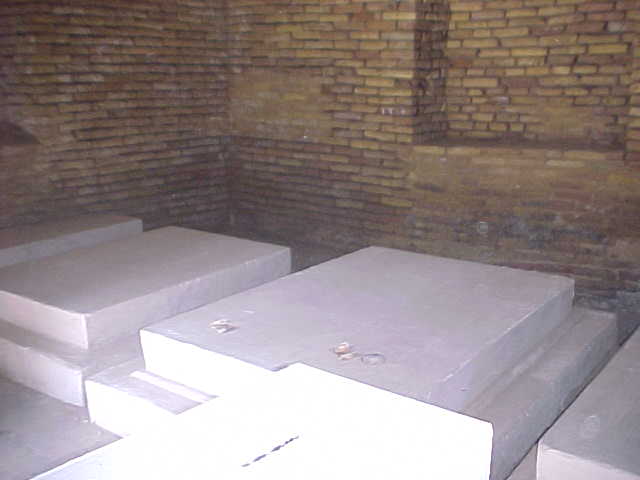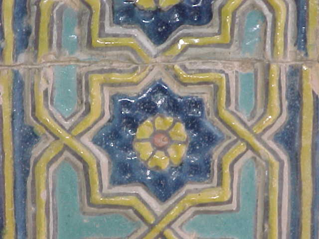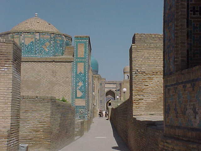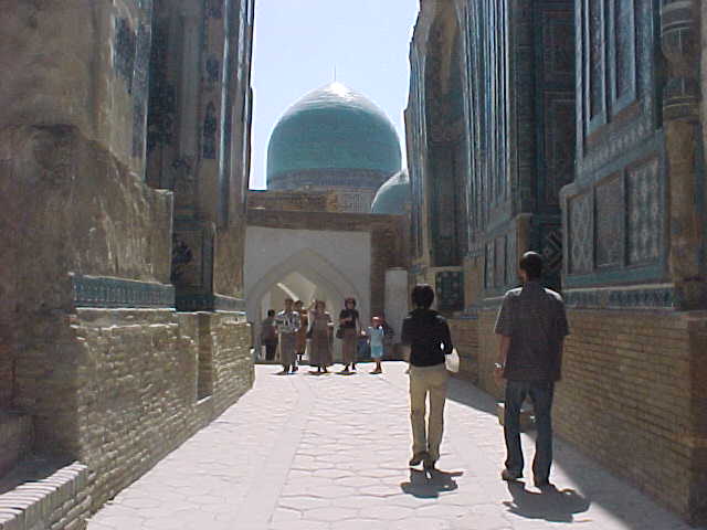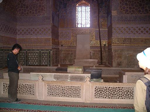 その後、少し歩いてShahr−i−Zindahへ行った。墓地のなかにあった。はじめに長い階段があって、そこを登りきると細めの一本道が奥に続き、そのまわりに小さな廟があり、廟の中には長方形を二つ重ねたような白いコンクリート製の墓がいくつかある、という構造になっている。アルフは、「行きと帰りで階段の数を数えて、同じだったら夢が叶う」という言い伝えがある、と言った。入場料は、1900スム(約228円)。やはり地元住民は200スム(約24円)、地元ガイドは無料である。日本人、また欧米人観光客が非常に多かったが、お祈りをしているウズベク人の姿もかなり見られた。祈りを唱えていたのはどこも男の人だった。誰かが祈りを唱え始めると、周りの人たちは、男も女も、手で水をすくうような形にして胸の前へ持ってきて祈っていた。これは、ゼミテンの一人・バングラデシュ人のカマルさんに、後日日本で聞いたところによると、一日五回のお祈りのそれぞれ後に行う、モナザという祈りだそうだ。また、廟の内部の壁が修復中であるものが多かった。真っ白な壁に黒でデザインが描いてある姿は、修復されたものとも手付かずのものとも違う美しさであった。ちなみにモザイクには3種類あり、@前に記した修復中の壁のように壁に直接文様が描かれているタイプ、A文様が描かれたタイルを壁にはめているタイプ、B各々単色のタイルを壁にはめこんで文様を描いているタイプ、であった。