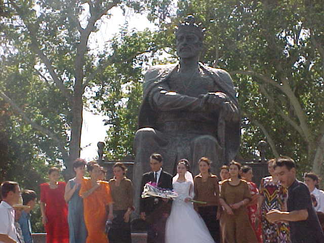 われわれが像を見ていると、リボンでラッピングされた車がやってきて、そこから白いウエディングドレスを着た花嫁と黒のスーツを着た花婿が登場、タクシーに乗った親族や友達も入り、われわれに「どけ!」といわんばかりに、ティムール像の前で記念写真を撮り始めた。『地球の歩き方』によると、結婚式のときには花婿と花嫁の思い出の場所で写真を撮るのだそうだ。またこの日、ティムール像の正面から見て道路の左の建物にマレーシア国王が来ていたらしく、黒いスーツを着た人の人だかりができていた。ブハラでもマレーシア国王を見かけたが、どうやらわれわれと彼は縁があるらしい(笑)