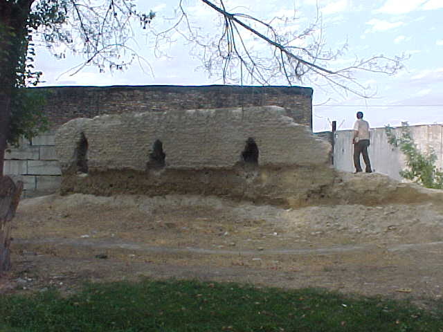 その後、やっと検問所を越えてフェルガナ盆地にたどり着いたわれわれのバンに乗り込み、市内を視察した。フェルガナの都市構造は、サマルカンドやタシケントと同様、都心を軸とした放射状街路になっている。扇の要に当たる部分には、ロシア帝国時代には砦があり、その壁が、一部分今でも残っている。高さは約3メートルくらいだった。脇が崩れかかっていたが、しっかりとした土作りになっており、上まで登ることができた。
