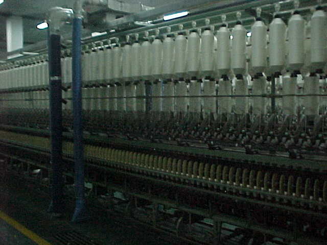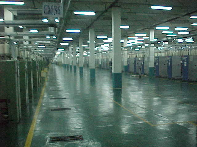 @の工程では、Trutzschler Dustex というドイツメーカーの紡績機が使われ、Aの工程では豊田製紡績機の他、韓国製の利化工業株式会社、Muratecという日本製の機械も使用されていた。綿糸の太さ・品質で分けられた12種類の製品を出荷しているとのことであり、恐らく製品別に紡績機を使い分けているのであろう。工場マネジャーの朴さんの話によると、60%が主として丸紅の仲介で購入した新品の機械、40%が韓国から持ってきた中古機械で、ソ連時代からの紡績機はすべて廃棄されたという。また、Bの工程では、スイスのUster、Zellweger、日本のシキボウの検査機器が使われていた。工場では毎年25,000トンの綿花を加工しており、一日の製品出荷量は5.5トンである。45.36キロのダンボールを1200箱出荷していることになる。工場は24時間フル稼働で、従業員の勤務時間は8時間の三つのシフトになっていた。生産ラインをすべてを見ることはできなかったが、全部で10万錘あるとのことである。工場内は機械音で大変うるさく、会話が成り立たないほどだったが、施設は清潔で、工場内の空気は換気が行き届いて粉塵もほとんどなく、生産ラインをはじめ備品に至るまできちんと整理されており、管理が行き届いている印象を受けた。