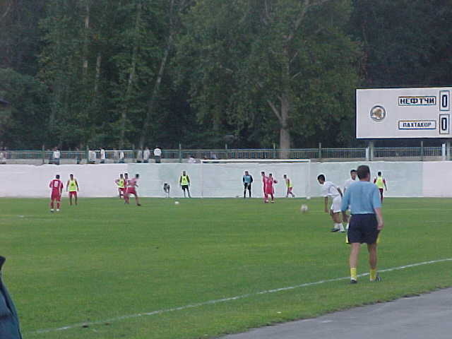 その後、帝政ロシア時代から残る建造物を求めて、市内中心部に位置する公園を視察した。劇場などいくつかあったが、そばまで行くと、幸運にもそこに隣接する競技場で、サッカーの試合が開始されようとしている。警備員のご好意により、数分間だけ試合前の様子を見ることができた。ウズベキスタンではサッカーのプロリーグがあり、我々が居合わせた試合は前年度の1位と2位の対戦だということだった。観客は試合前というのに大変熱狂的で、ウズベキスタンでのサッカー人気をうかがわせた。プロリーグがあるという事実に大変驚いたので、ガイドに聞いてみたところ、かつては職業ごとのアマチュアチームが試合をしていたものが、近年プロリーグとして組織されたのだそうだ。トップリーグの下には二部リーグも存在し、サッカー先進国並みの組織形態がとられている。大衆娯楽としてのプロスポーツが根付きつつあるウズベキスタンの現状に、改めて驚かされた。公園には、自由商業なのであろう、立ち売りの屋台がたくさんならんでおり、アイスクリームから学校の教科書まで売っている。勉強意欲に燃えるゼミテンの何人かは、ロシア語やウズベク地理の教科書を入手した。アイスクリームはわずか100ソムで、大変に美味だった。