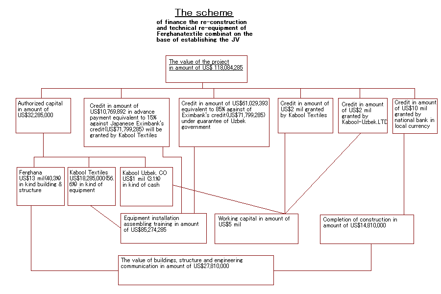 甲乙繊維のウズベキスタン進出に際し必要な118,084,285米ドルの投資のうち、71,799,285ドルを、その85%についてウズベク政府の信用保証のもとに日本国際協力銀行が融資した。日本国際協力銀行の融資利率は、当初2年据え置き、7年で4.5%である。また地元の金融機関は、1千万ドルのスム建て融資(利率は名目30%だが、国内インフレのため、実質利率は10%前後)を供与した。さらに、甲乙繊維のソウル本社と、その子会社である甲乙ウズベク社も、それぞれ2百万ドルの信用を供与した。さらに、ウズベク軽工業協会Uzbek Light Industry Association(前々日JETROで伺った、社会主義時代の政府軽工業省が姿を変えた組織)が、工場の建物や土地など1300万米ドル相当の現物出資を行っている。建物の外構はソ連時代のものを活用し、内装を作り直した。