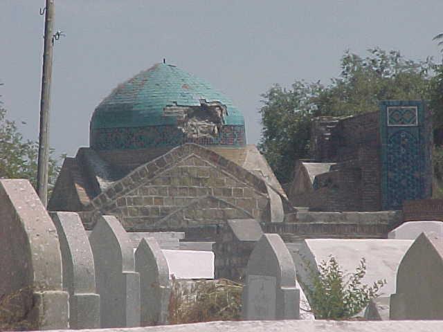 マドラサの裏手は、地元民の墓地になっている。進んでいくと、周辺の林の中に青いドームが見えてきた。廃墟のようになった Modari Khan mausoleumは、1825年にコーカンドの汗(王)が母親の為に建造したお墓である。今まで見てきたイスラム建築に比べると規模は小さいが、細部まできれいに装飾されている。さらにそこから100mほど離れたところには、コーカンドの汗のお墓であるDakhma-i-Shokhonがあった。そのお墓も青のタイルで装飾されていて、とても美しい。
