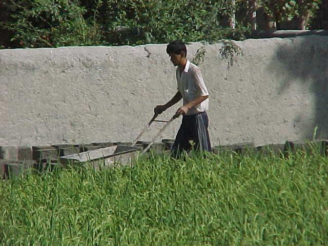 8:30に出発する。最初に向かうのは、コーカンドである。コーカンドはフェルガナよりも西なので、行程はちょっと戻ることとなる。途中、道路は幅広い灌漑水路を横切り、水田地帯の中を走った。そこで車を止め、水田を見学した。稲はまだ青かったが、すでに稲穂は垂れていた。