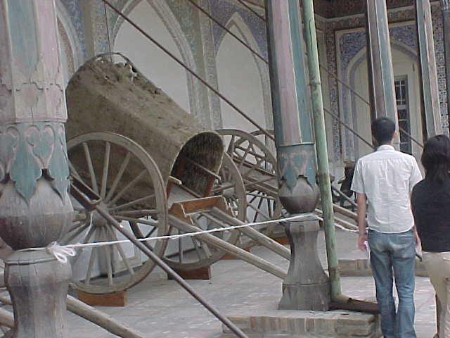 この王宮では、博物館の方が英語でガイドをしてくれた。この博物館には、コーカンド汗国で使用されていた、多くの調度品が展示してあった。これらは、コーカンド汗国がいかに交易によって栄えたかを示している。特に清朝との交易の影響は大きく、陶器のほか、「長勝神砲」と刻印された中国製の大砲もあり、中国経由で入ってきた、日本産の壷も展示してあった。その他、イラン、インド、アフガンや、ロシアなどから入ってきた多くの品物も展示されていた。民族衣装や装飾品も多く、スザンナと呼ばれる絨毯は、地区ごとに文様が異なるそうである。1960年代にソ連により、本格的に修復が始まったが、内装の装飾はロシア正教会で見られたような発色のきつい油性絵具で行われ、オリジナルのイメージと食い違っていたため、現在それを天然の絵具によって塗りなおしているところであった。