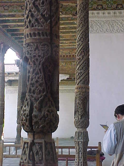 11:15分に王宮を離れ、われわれはジュマモスクJuma Mosqueに向かった。ジュマモスクは中央に大きなミナレットが立っていて、その周りを木彫りの柱が立ち並ぶモスクが取り囲んでいる。その装飾は細部まで手が込んであり、見事なものであった。このジュマモスクでは、最初に管理人のおばさんの方に一人US$1ドルと請求された。ゼミ生の何人かが払った後で、運転手さんが話をつけると、なぜかお金は払わなくて良くなった。既に払った分は戻ってこなかったが。このUS$1は、管理人のおばさんのお小遣いだったのかもしれない。運転手さんの計らいで、鍵がかかかって入れなかったミナレットにも登れることとなった。そこからは、樹木に覆われたコーカンドの街並みがとてもきれいに見えた。